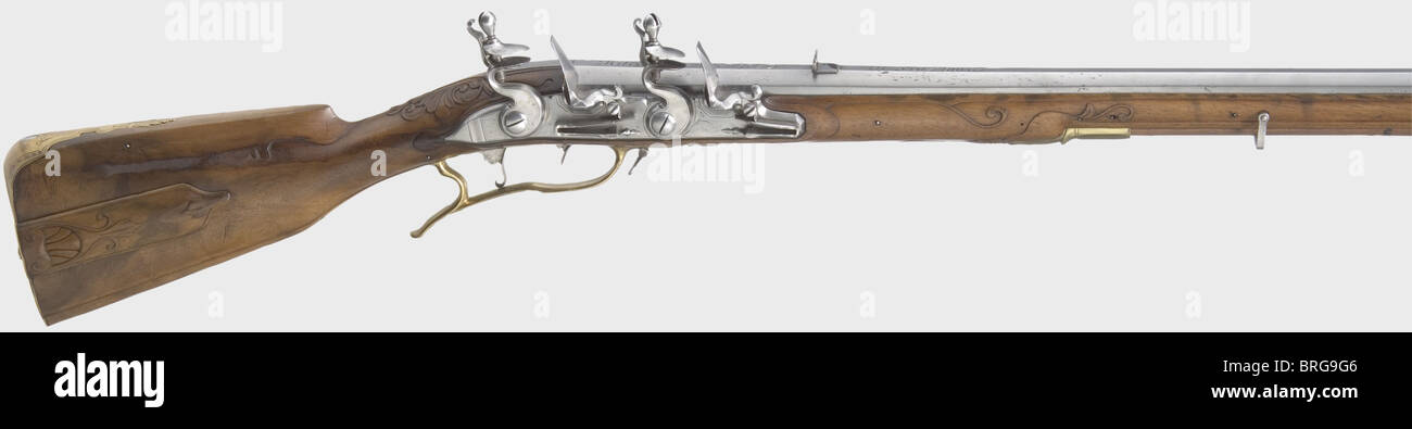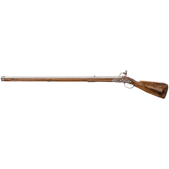 A German Flintlock Rifle Circa 1760 Heavy Damascus Barrel 17th Century With Smooth Bore In 21 Mm Calibre And A Cannon Muzzle The Top Of The Barrel Is Richly Set With Ornamentally Engraved Silver Silver Inlaid