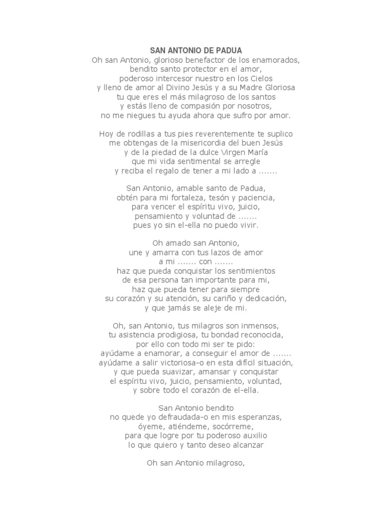 Oración infalible a San Antonio Oh bendito San Antonio él más gentil de todos los santos tu amor por Dios y tu caridad por sus criaturas te hicieron merecedor cuando estabas aquí en la. Oh beato San Antonio el más amado de los santos tu amor por Dios y la caridad por sus criaturas te hizo digno cuando estuviste en la tierra de tener poderes prodigiosos. REZO INFALIBLE A SAN ANTONIO O h bendito San Antonio él más gentil de todos los santos tu amor por Dios y tu caridad por sus criaturas te hicieron merecedor cuando estabas aquí en.